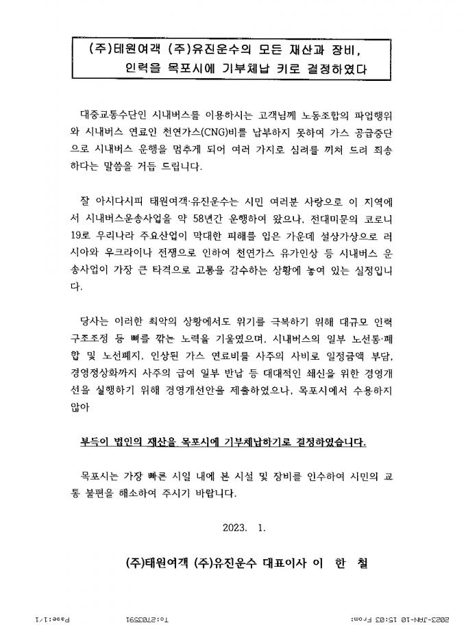12일 목포시에 따르면 이 대표는 "가스공급 중단으로 버스 운행을 멈추게 돼 죄송하다"면서 "태원·유진운수의 모든 재산과 장비, 인력을 목포시에 기부채납키로 결정했다"고 지난 10일 통보했다.