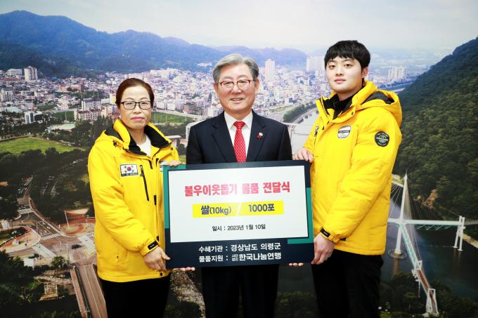 (사)한국나눔연맹(이사장 안미란)은 지난 10일 의령군청을 방문해 쌀 10kg 1000포(시가 3000만원 상당)의 물품을 기탁했다.