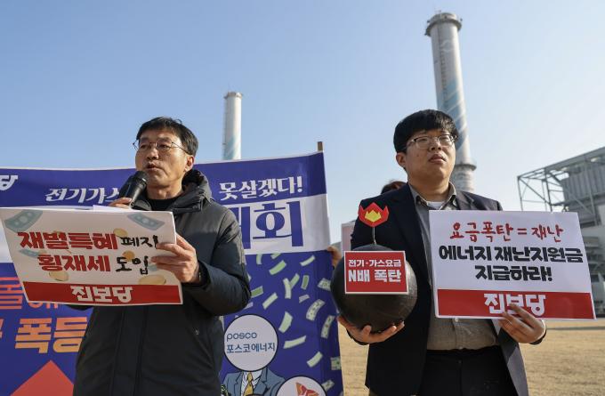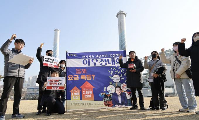 12일 오전 서울 당인리발전소 앞 마포새빛문화숲 앞에서 진보당 주최로 '전기·가스요금 폭탄, 못살겠다' 아우성 대회가 열렸다.
