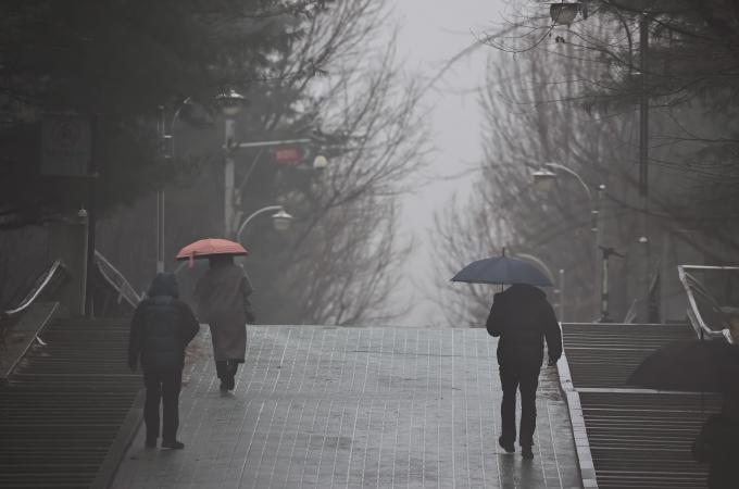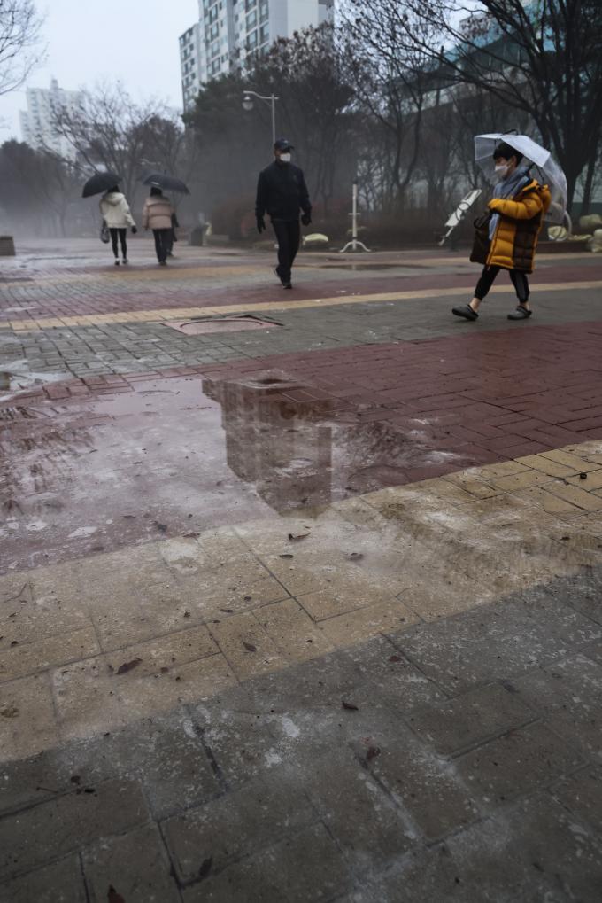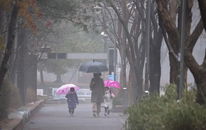 13일 아침 유치원 등굣길에 나선 어린이가 보호자와 함께 겨울비가 안개를 만든 공원길을 걸어가고 있다.