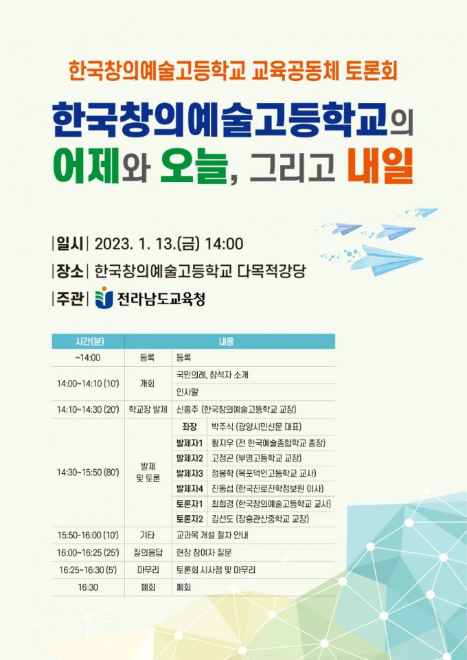 이날 토론회는 전라남도교육청 주관으로 어제와 오늘, 그리고 내일이란 주제로 신홍주 한국창의예술고 교장과 황지우 전 한국예술종합학교 발제를 시작으로 대화가 진행될 예정이다.