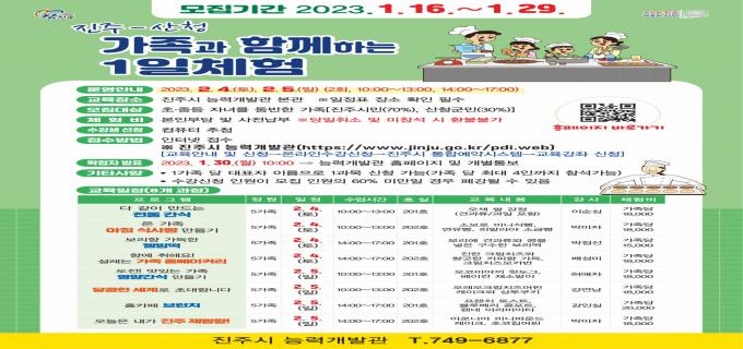 신청자격은 초·중등 자녀를 동반하는 진주·산청에 주소지를 둔 가족이면 누구나 참여할 수 있다. 희망자는 진주시능력개발관 홈페이지를 통해 신청하면 된다.