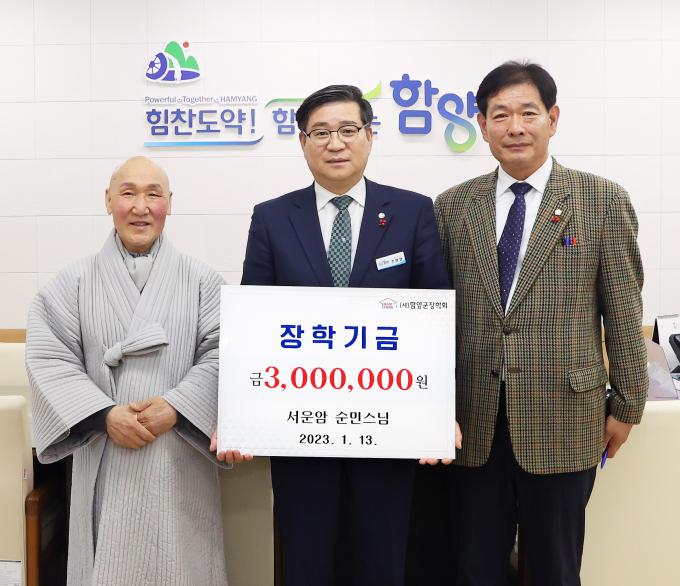 함양 서상면에 위치한 서운암의 주지 순민스님이 13일 사단법인 함양군장학회에 기초노령 연금으로 받은 300만 원을 기탁했다.