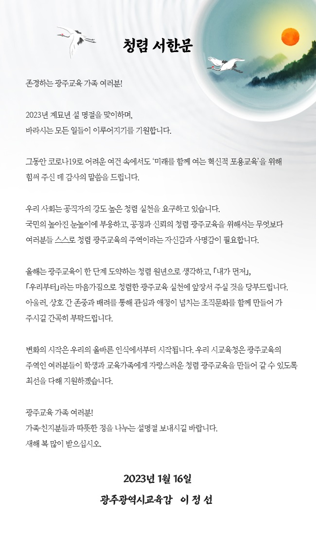 16일 광주시교육청에 따르면 이 교육감은 청렴 서한문을 통해 "2023년을 광주교육이 한 단계 도약하는 청렴 원년으로 삼고, 청렴 광주교육 실천에 앞장서 줄 것"과 "상호 간 존중과 배려를 통한 관심과 애정이 넘치는 조직문화를 함께 만들어가자"고 전했다.