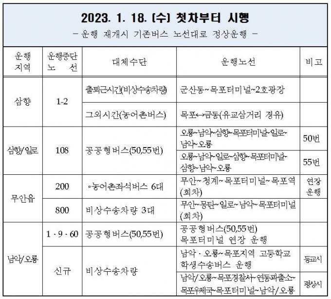 무안군은 오는 18일부터 200번 노선의 경우 무안읍에서 목포터미널까지 운행하는 비상수송노선을 목포역까지 연장 운행하고 버스 2대를 늘려 모두 6대로 운행한다.
