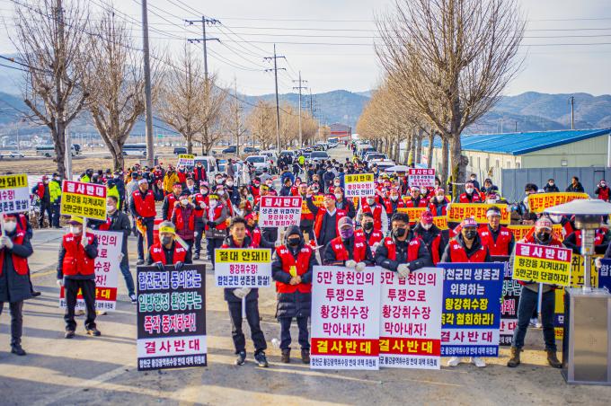 합천 황강 광역취수장 군민대책위원회(박오영 위원장)는 17일 율곡면 낙민리에 위치한 황강 죽고지구 하천 정비사업 사무실 앞에서 1000여 명이 참석한 가운데 '황강 광역취수장 설치 계획' 철회를 요구하는 궐기대회를 열었다.