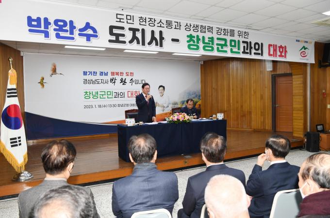 이날 군청 대회의실에서 열린 '군민과의 대화'에서는 박완수 도지사, 조현홍 창녕군수 권한대행, 김재한 군의회 의장, 성낙인·우기수 도의원을 비롯해 주민대표 등 200여 명이 참석했다.