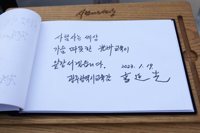 방명록에는 '사람 사는 세상. 가슴 따뜻한 광주교육이 앞장서겠습니다'고 적었다.