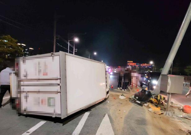 부산 명지동서 냉동탑차가 구조물 충격 후 전도…운전사 사망