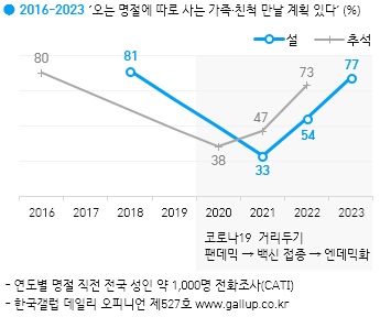 한국갤럽이 지난 17∼19일 전국 만18세 이상 1000명을 대상으로 여론조사를 한 결과, 부산울산경남 응답자의 81%가 이번 설 연휴에 따로 살던 가족이나 친척을 만날 계획이 있다고 답변했다. 만날 계획이 없다는 답변은 19%다.