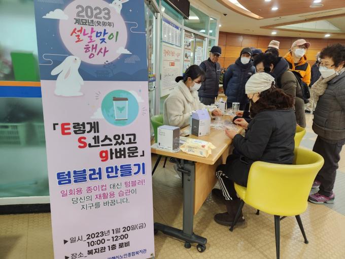 재단은 20일 김해시노인종합복지관 이용자 100여 명을 대상으로 '2023 설날맞이 'E렇게 Sᅟᅦᆫ스있고 gㅏ벼운 텀블러' 만들기 행사를 진행, 환경문제와 자원 재사용에 대한 인식을 높였다.