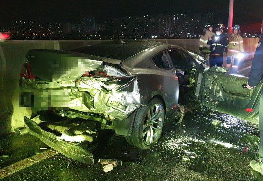 부산소방본부 등에 따르면, 30대가 몰던 제네시스 쿠페 차량이 앞서 달리던 GV80(운전자 50대) 승용차를 추돌했다.