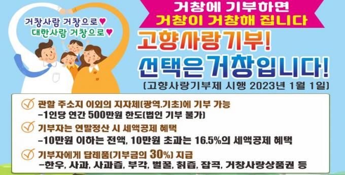 군은 '고향 사랑 기부금, 선택은 거창입니다!'라는 슬로건으로 설 명절을 대비해 차량 이동이 많은 주요 도로에 고향사랑기부제 홍보 현수막을 게시하고 전광판과 SNS에 홍보하는 등 고향사랑 기부제 알리기에 총력을 기울이고 있다.