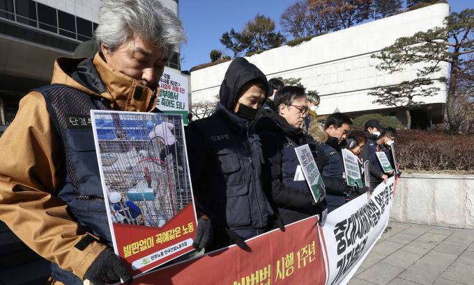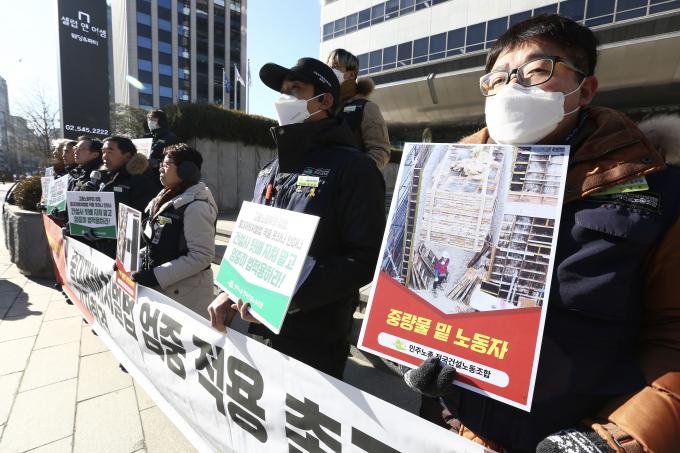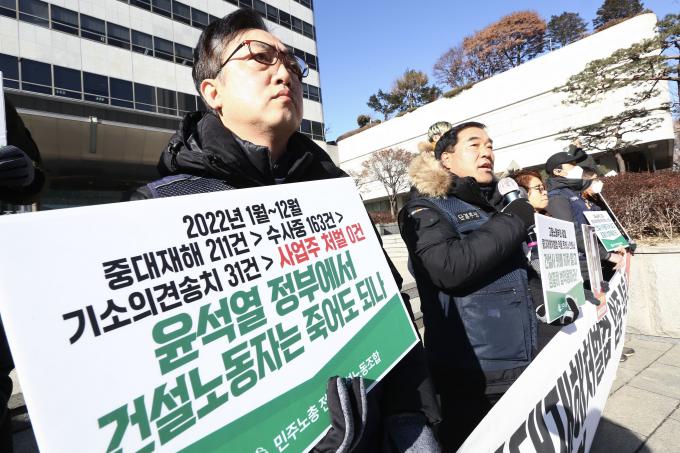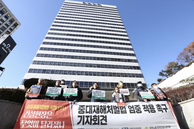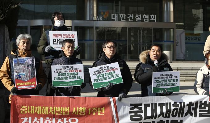 전국건설노동조합 조합원들이 25일 오전 서울 강남구 논현동 대한건설협회 앞에서 건설현장 실태 폭로 및 건설사-정부-검찰 규탄 기자회견을 했다. 이날 기자회견에서 장옥기 건설노조 위원장은 "중대재해처벌법 시행 1주년을 맞았지만 여전히 건설현장에서는 제대로 적용되지 않는다"며 "정부와 검찰이 법을 엄중하게 적용할 것"을 촉구했다.