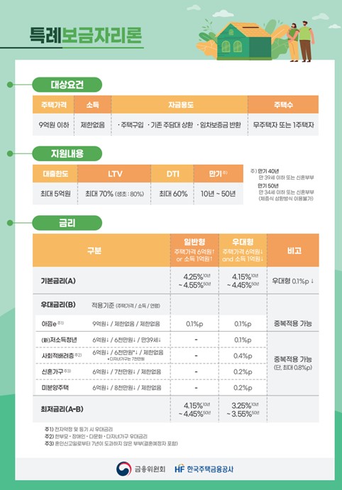 '특례보금자리론'은 금리 상승기 서민·실수요자의 금리변동 위험을 덜어주고자 안심전환대출과 적격대출을 통합해 1년간 한시적으로 운영되는 상품이다. 주택가격 9억 원 이하인 경우 소득 제한 없이 최대 5억 원까지 신청 가능하다.