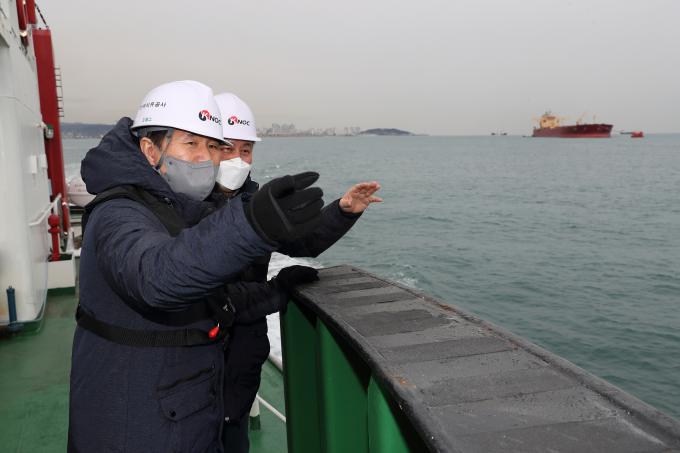 김동섭 사장은 26일 울산비축기지를 방문, 기지 내 시설물 관리상황에 대한 종합보고를 받고 해상 작업선에 승선해 '부이'(Buoy) 등 해상 원유 입출하 장비의 유지보수 상태를 직접 점검했다.