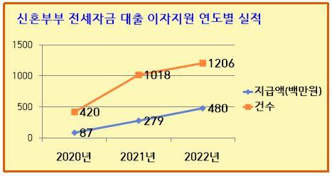2020년 주거비 부담이 큰 신혼부부들에게 실질적인 도움을 주고자 처음 시작된 이번 사업은 지난해 총 1206건, 4억8000여만 원의 실적을 거뒀으며 해마다 청구 건수가 증가하고 있는 추세이다.