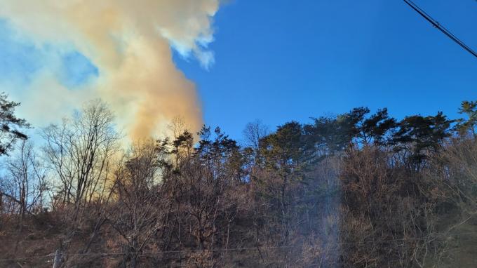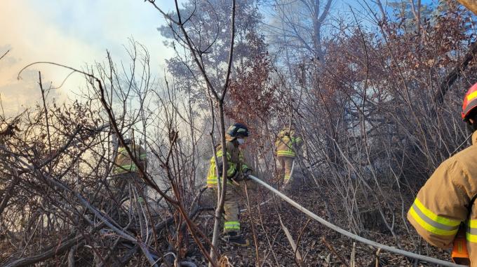 소방당국은 헬기 2대를 진화 장비 17대, 인력 115명을 투입해 50분 만에 진화한 뒤 잔불 정리작업을 하고 있다. 피해 임야는 0.02ha(200㎡)로 파악됐다. 다행히 인명피해는 없었다.