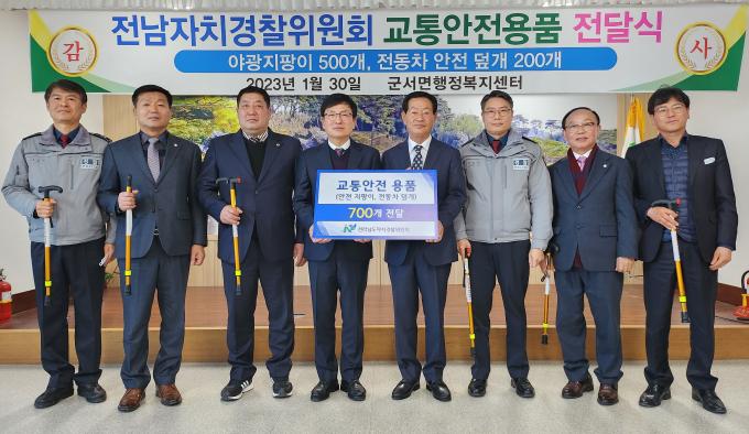 자치경찰위원회는 30일 조만형 전남도자치경찰위원장, 손남일 전남도의회 의원 등 50명이 참석한 가운데 영암지역 노인에게 교통사고 예방을 위한 야광 지팡이 500개와 전동차, 휠체어에 붙이는 안전 덮개 200개를 거동이 힘든 노인에게 우선 전달했다.