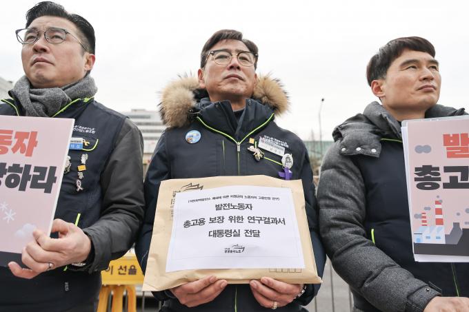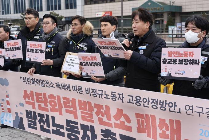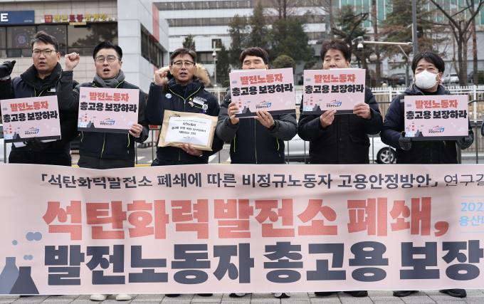 31일 오전 서울 용산 대통령 집무실 앞에서 공공운수노조 발전비정규직 노조원들이 석탄화력발전소 폐쇄에 따른 발전노동자 총고용 보장을 촉구하는 기자회견을 열었다.