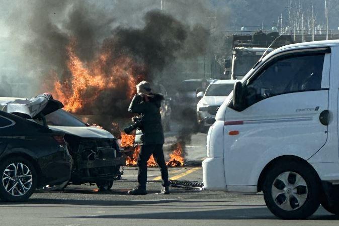 KPI뉴스 - 창원 삼동교 사거리서 차량 3대 충돌로 SUV 화재…1명 부상