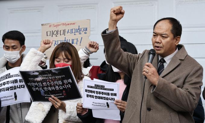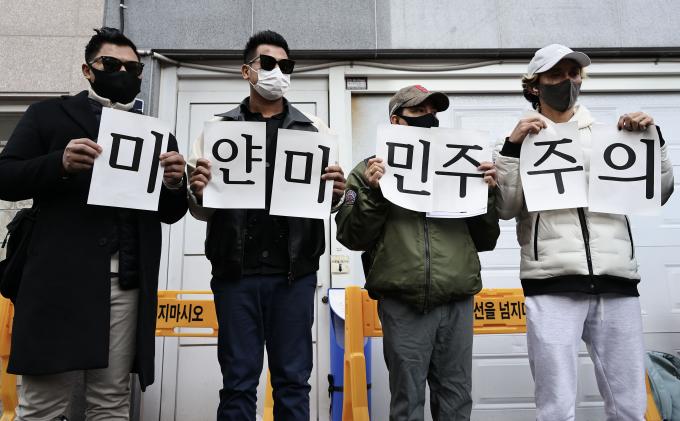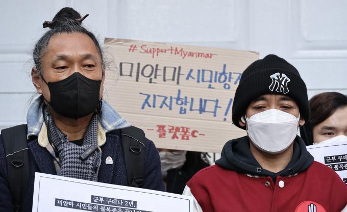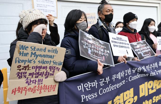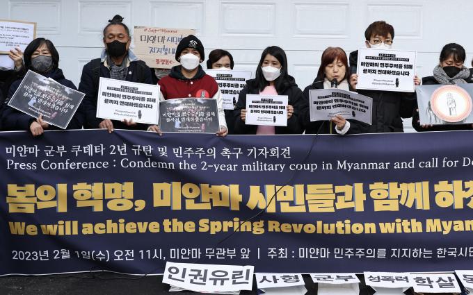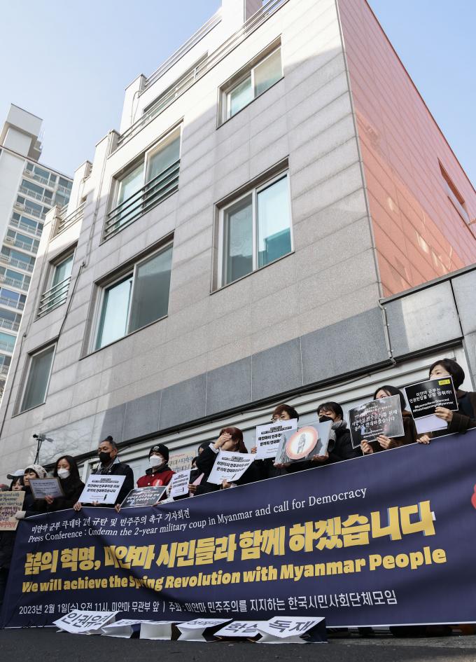 미얀마에 군부 쿠데타가 발생한 지 2주년이 된 1일 오전 서울 성동구 옥수동 주한 미얀마 대사관 무관부 앞에서 '군부 쿠데타 규탄 및 민주주의 촉구 기자회견'이 열렸다.