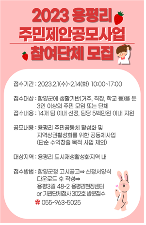 인당마을은 환경정비와 마을 활성화 등 일반공모 분야로 국한된다. 신청 대상은 함양군에 생활기반을 둔 3인 이상의 주민 모임 또는 단체다. 함양군은 14일까지 신청을 받은 뒤 선발된 팀당 최대 500만 원을 지원한다.
