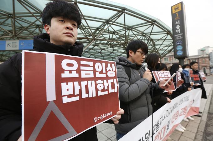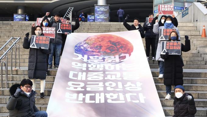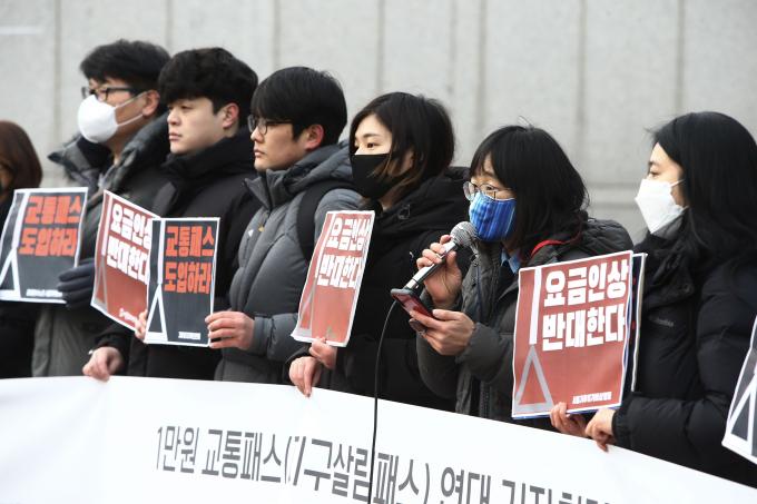 서울시 대중교통요금 인상 반대 및 1만원 교통패스 도입을 촉구하는 기자회견이 3일 오전 서울역 앞에서 열렸다.