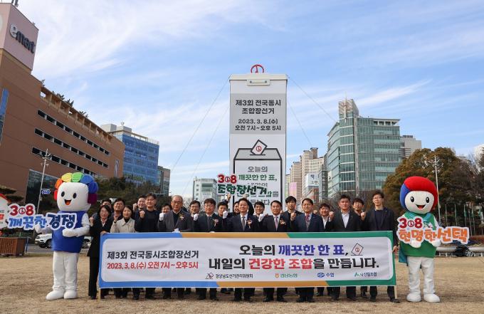 경남선관위는 농협·수협·산림조합 경남지역본부와 함께 조합장선거 D-30일을 맞아 6일 오후 창원광장에 높이 7. 3m 폭 2m의 대형 투표함 모형의 공명선거 선전 조형물을 설치하고 제막식을 가졌다.