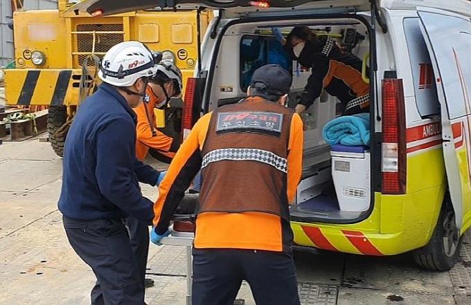 ▲ 6일 오후 부산 해운대 오피스텔 공사장에서 119구급대가 실족 근로자를 병원으로 이송하고 있다. [부산소방본부 제공]