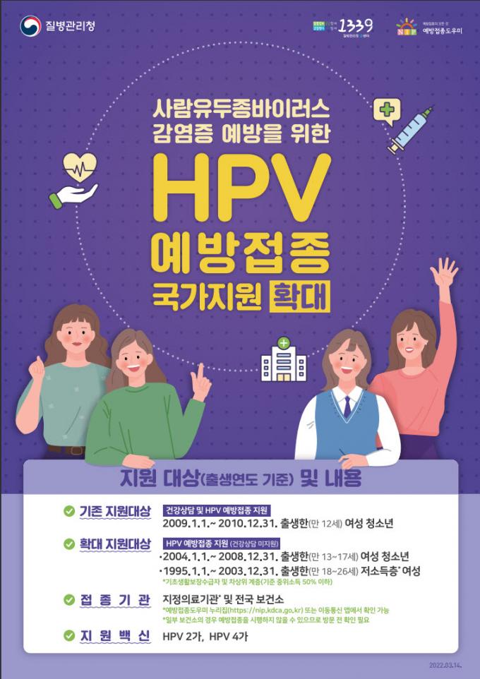 만12~17세(2005~2011년생)의 모든 여성청소년과 만18~26세(1996~2004년생)의 기초생활보장수급자와 차상위계층 등 저소득층 여성은 무료로 HPV 예방접종을 받을 수 있다.