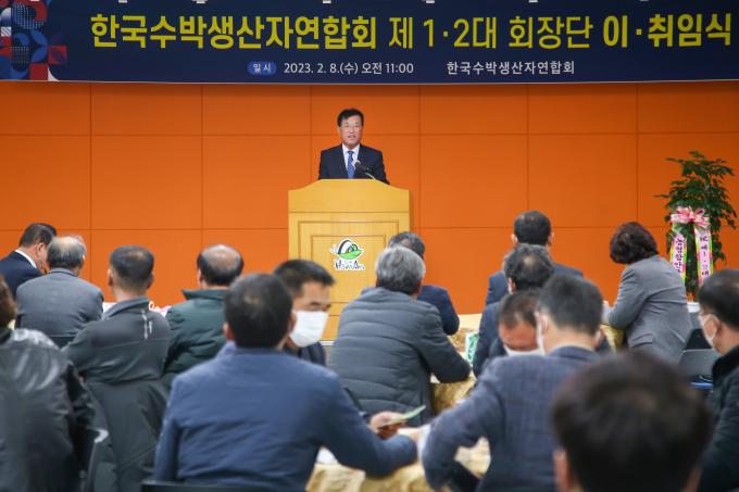 한국 수박생산자연합회 이·취임식이 8일 오전 함안문화예술회관 연회장에서 전국 회원 50여 명이 참석한 가운데 열렸다.