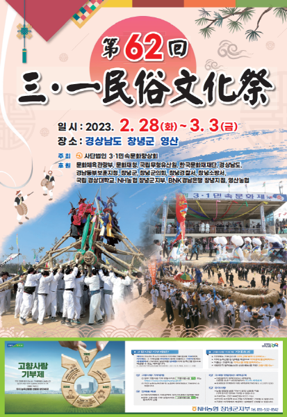 제62회 3.1민속문화제는 2월 28일 전야제로 흥을 돋우고 3월 3일까지 4일간 창녕군 영산면 영산 놀이마당 일원에서 개최할 계획이다.