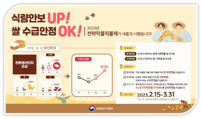 지원 자격은 논 농업에 활용된 농지에서 전략 작물을 재배하는 농업인과 농업법인이다. 신청 방법은 농지 소재지가 있는 읍면동 행정복지센터에서 오는 15일부터 3월 31일까지 방문 신청하면 된다.
