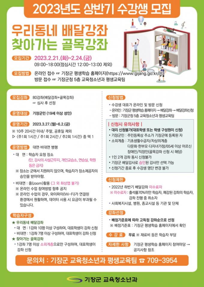 대면 강좌 10인 이상, 비대면 강좌 7인 이상 학습자가 구성돼야 강좌를 신청할 수 있다. 골목강좌는 7인 이상의 소외계층으로만 구성돼야 신청 가능하다. 자세한 사항은 기장군 평생학습 홈페이지를 참고하면 된다.