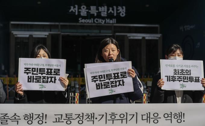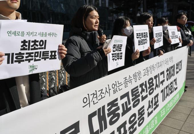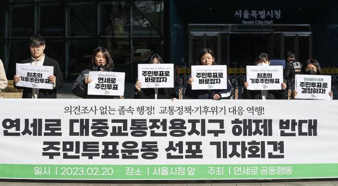 서울의 유일한 대중교통 전용지구인 연세로의 일반차량 통행 허용을 반대하는 '연세로 공동행동' 활동가들이 20일 오전 서울 시청 앞에서 기자회견을 열고 서울시의 '신촌 대중교통전용지구 운용 일시 정지 추진' 계획을 비판하며 주민투표운동을 선포하였다.