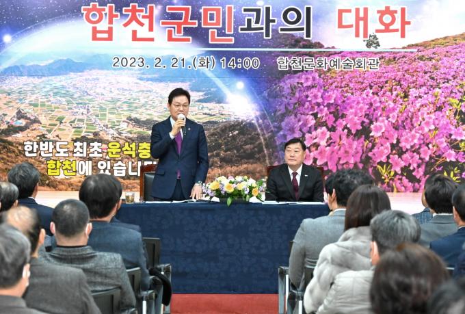 이날 '군민과 대화'는 김윤철 군수, 조삼술 군의회 의장, 경남도의회 의원 등 250여 명이 참석한 가운데 민선8기 도정비전 발표, 군 현안보고, 군민과의 대화 순으로 진행됐다.