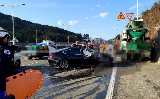부산 석대나들목 인근 승용차-레미콘 추돌사고…40대 운전자 중상