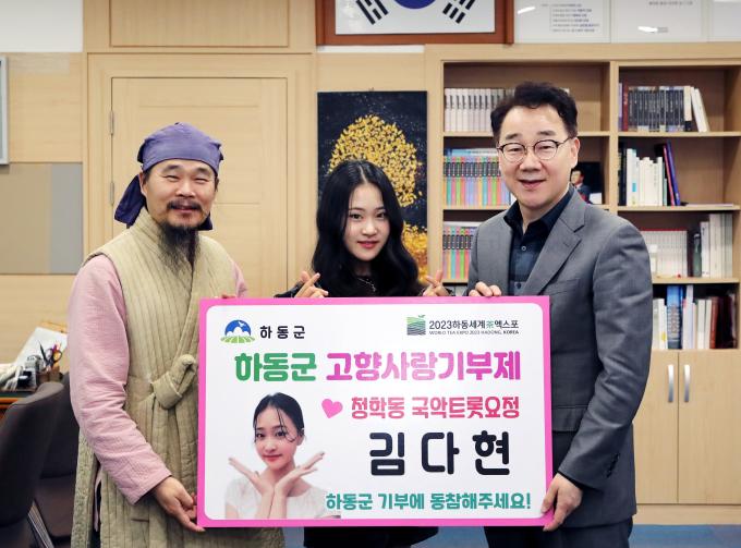 김다현은 "고향사랑기부를 통해 하동군에 조금이나마 보탬이 될 수 있어 기쁘다"며 "기부금이 잘 모여 하동이 계속해서 살기좋은 곳이 되길 바란다"고 하동에 대한 사랑을 표현했다.