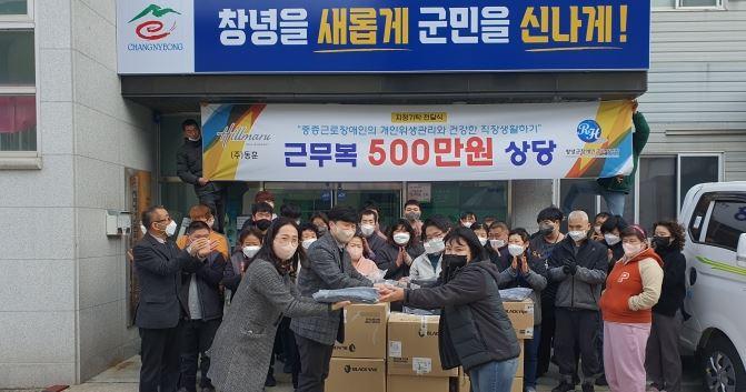 ㈜동훈 힐마루 컨트리클럽(회장 김점동)은 21일 창녕군장애인근로사업장의 중증 근로장애인들에게 500만 원 상당 근무복을 전달했다.