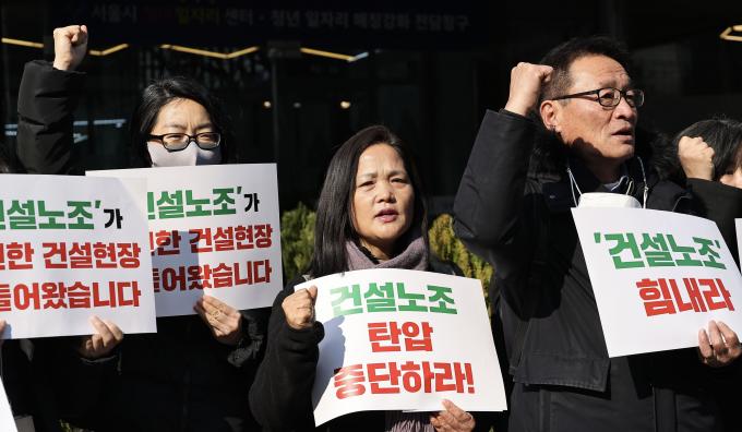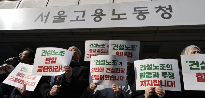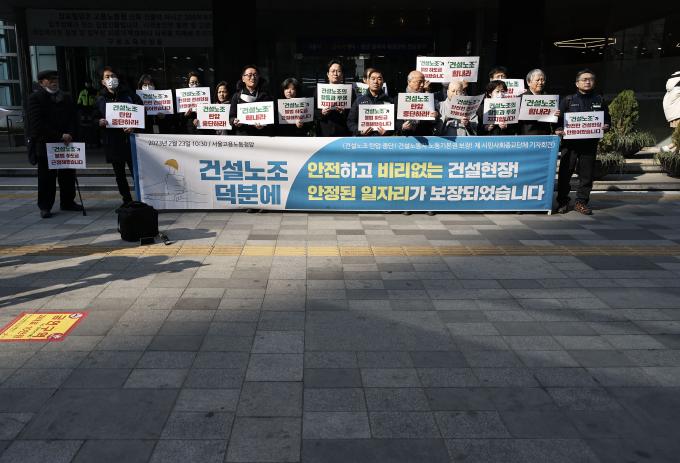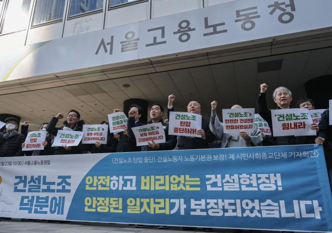 건설노조 탄압 중단과 건설노동자 노동기본권 보장을 촉구하는 487개 제 시민사회종교단체들의 기자회견이 23일 오전 서울 중구 서울지방고용노동청 앞에서 열렸다.