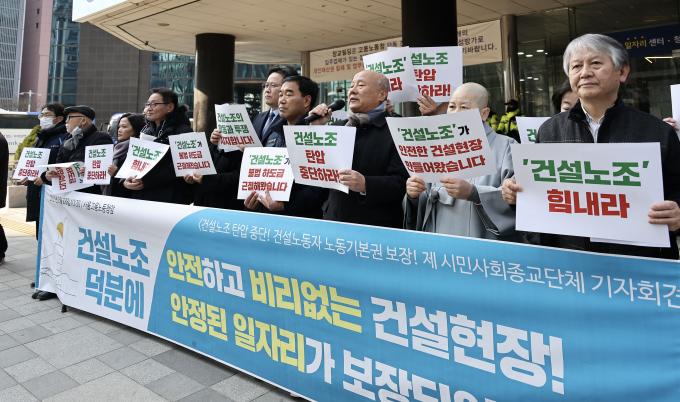 기자회견에 참석한 시민사회종교단체 대표들은 "전체 산재사망자의 절반 이상이 건설현장에서 발생하고 있고, 한해 417명의 건설노동자가 안타까운 목숨을 잃고 있다"며 "온갖 불법과 부조리가 넘쳐나는 건설 산업현장의 구조적 문제해결을 위해 나서야 하는 정부가 건설노조 탄압에만 몰두하고 있는 상황"이라고 규탄했다. 그러면서 건설노동자들의 노동기본권 보장과 안전하고 투명한 건설현장을 만들 근본 대책 마련을 촉구했다.