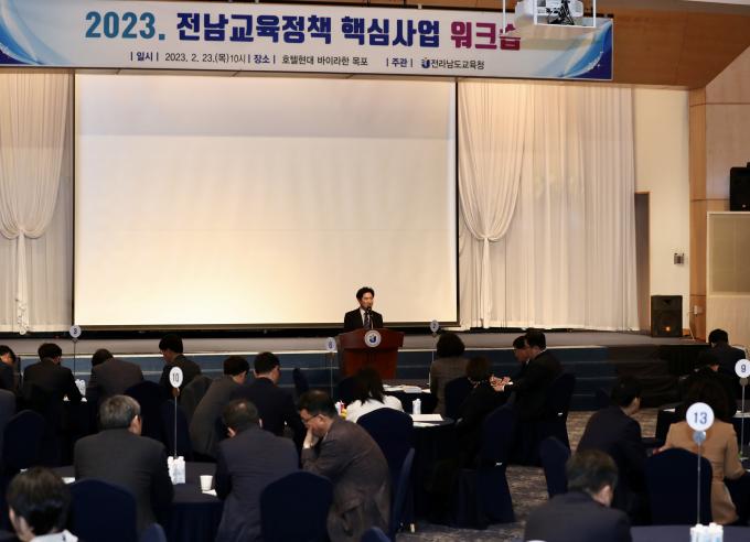 김대중 교육감, 미래 변혁적 역량 끌어 내야 전라남도교육청이 2023 전남교육정책 핵심사업 워크숍에서 '데이터·디지털 기반 전남미래교육으로 전환'을 다짐했다고 24일 밝혔다.