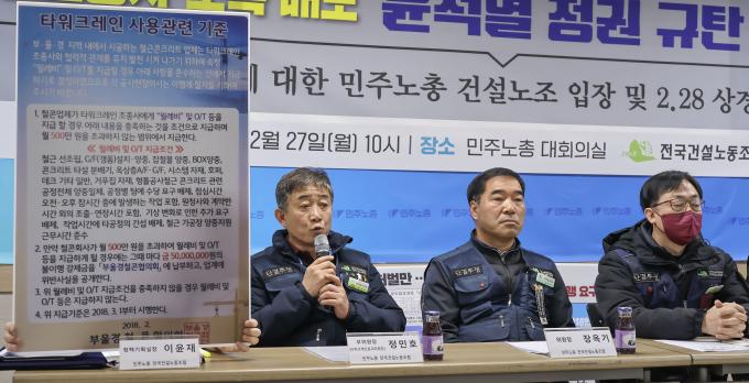 이날 기자회견에 참석한 정민호 건설노조 부위원장(타워크레인분과위원장)은 "오늘(27일) 월례비를 거부하는 공문을 건설협회에 보냈다. 타워크레인 노동자들은 월례비의 대가로 강요받은 추가 근무와 안전규정을 위배하는 작업을 거부하며, 주 52시간 노동과 안전작업을 지켜내겠다"고 밝혔다. 그는 건설업계를 향해 "그동안 월례비를 주면서 요구했던 작업을 강요하지 말라. 월례비를 뿌리 뽑기 위해서는 건설업계도 함께 이행해야 하는 것"이라고 말했다.