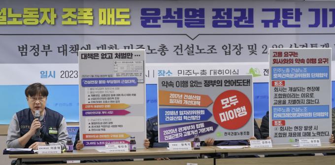 또 건설업계를 향해서도 "2018년 건설산업 혁신 노사정 선언문, 2018년 건설산업 생산구조 혁신 노사정 선언문, 2021년 건설업 적정임금제 정착과 확산을 위한 상생협약서 등 여러 차례 합의된 내용이 있지만 이행된 것은 아무것도 없다"며 지금까지 약속했던 모든 사항을 이행하라고 요구했다.