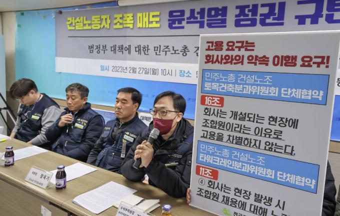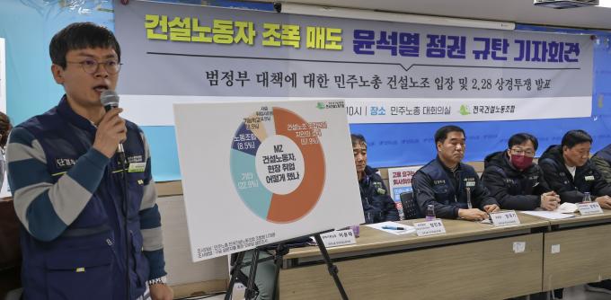민주노총 전국건설노동조합(위원장 장옥기)이 27일 오전 서울 중구 민노총 회의실에서 기자회견을 열고 최근 정부의 건설노동자 조폭 매도와 범정부 대책에 대한 입장을 발표했다.