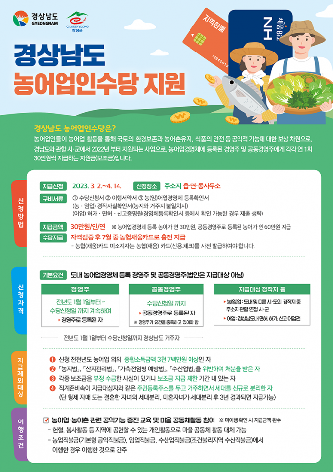신청 대상은 2022년 1월 1일부터 수당 신청일까지 계속해서 도내에 거주하면서 신청일 기준 창녕군에 주소를 두고 농어업경영체 등록을 유지한 경영주와 공동경영주다. 경작지 또는 어업권이 경남도 내에 있어야 한다.