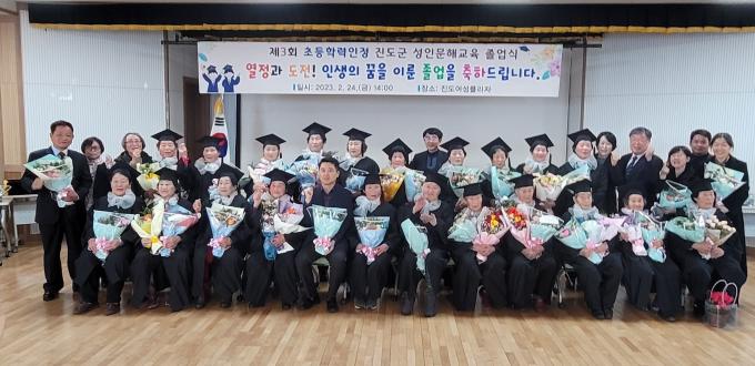 28일 진도군에 따르면 최고령 김삼심 할머니를 비롯한 23명의 만학도가 전라남도교육감 지정 초등과정 학력인정 문해교육 프로그램 운영기관 3곳에서 해당 과정을 이수해 가족이 참석한 가운데 졸업식이 거행됐다.