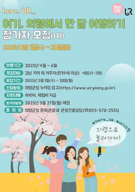 이번 1차에 선정된 참가자는 4~6월 의령 여행과 홍보를 진행한다. 2차·3차 모집은 6월과 9월에 이뤄진다.