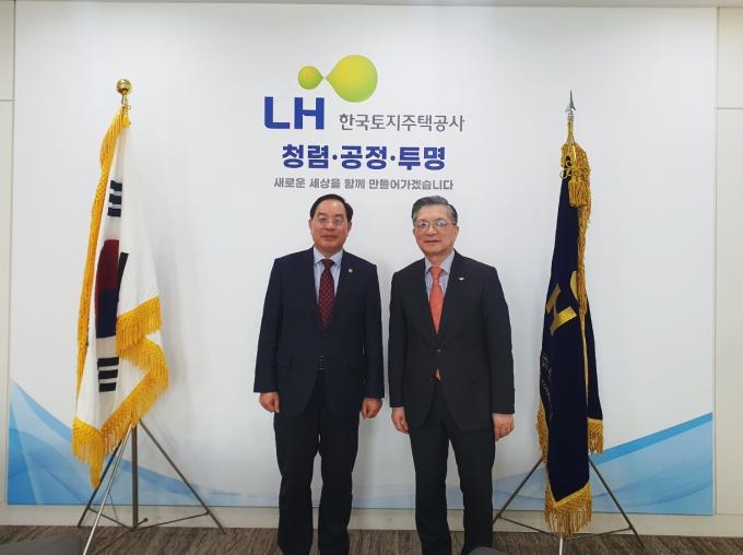 이한준 사장 "국토부 훈령 따라, 연 이자 5% 가산 원칙" 하윤수 부산시교육감은 6일 오후 경남 진주시 한국토지주택공사(LH) 본사를 방문, 이한준 사장을 비롯한 관계자들과 최근 기장·정관 신도시 택지 내 학교 용지 이자 부과 건에 대해 의견을 나눴다.